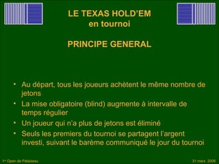 Le document décrit les règles et déroulements du tournoi de Texas Hold'em au premier Open de Palaiseau le 31 mars 2006, incluant l'inscription, l'installation, les étapes de distribution de cartes, et les tours d'enchères. Il souligne aussi le système de gains et les conditions d'élimination des joueurs. Enfin, des précisions sont données sur la conduite à adopter et les trophées associés au tournoi.