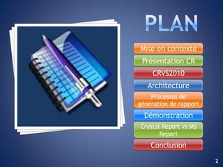 Le document présente une analyse approfondie de Crystal Reports 2010, un outil de reporting créé par Crystal Services Inc. Il aborde son historique, ses fonctionnalités, ses nouveautés, et compare Crystal Reports avec les solutions Microsoft Reporting. En conclusion, il souligne l'importance du reporting pour l'efficacité de gestion au sein des entreprises, tout en mettant en avant la simplicité et la richesse fonctionnelle de Crystal Reports dans l'écosystème .NET.