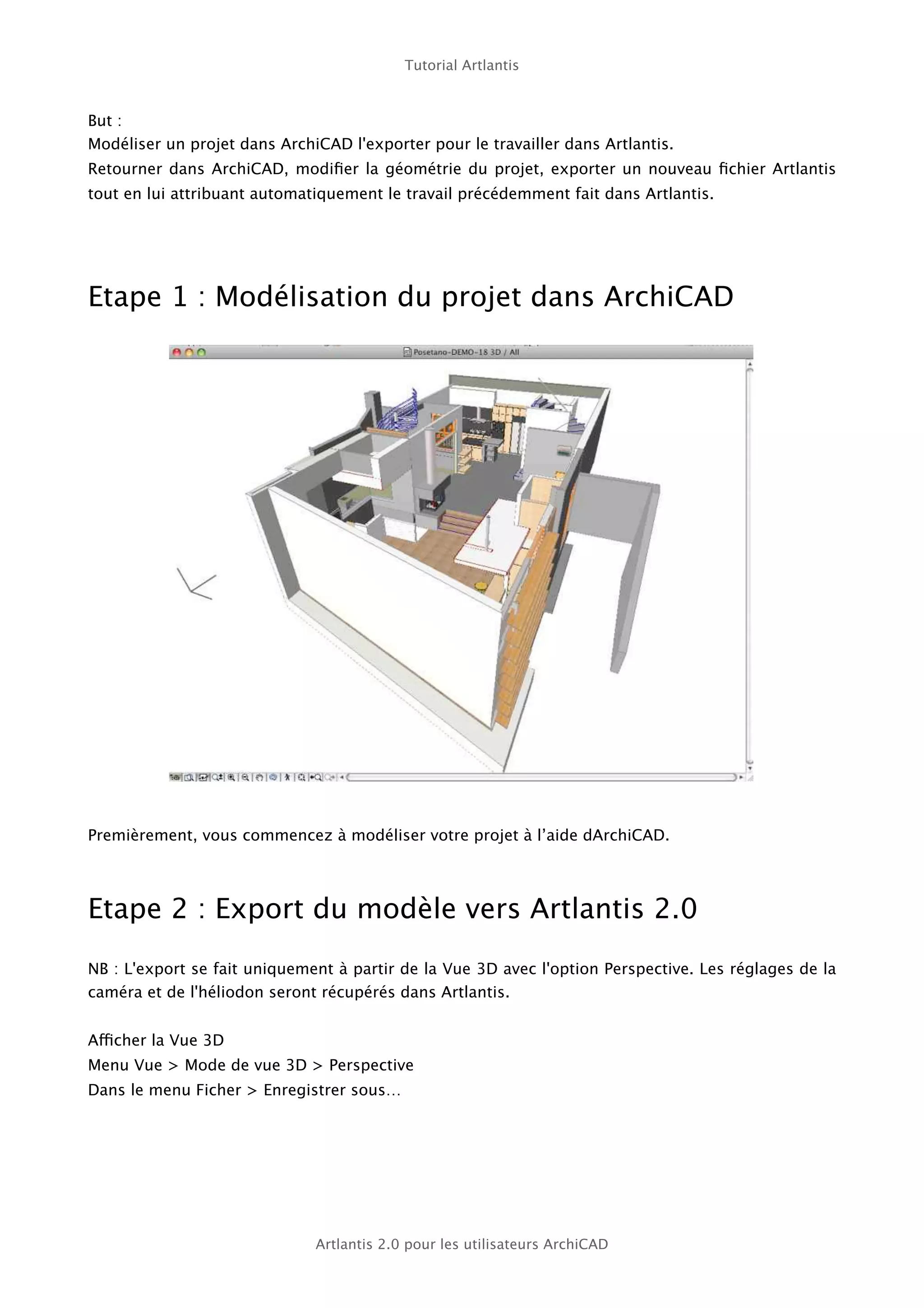 Le tutoriel guide les utilisateurs d'Archicad sur la modélisation et l'exportation de projets vers Artlantis 2.0. Il détaille les étapes de l'exportation, de l'importation et de la mise à jour des projets dans Artlantis, tout en soulignant l'importance des configurations de caméra, de lumière et des textures. Le document met également en avant la capacité d'Artlantis à récupérer des modifications apportées au projet initial dans Archicad.