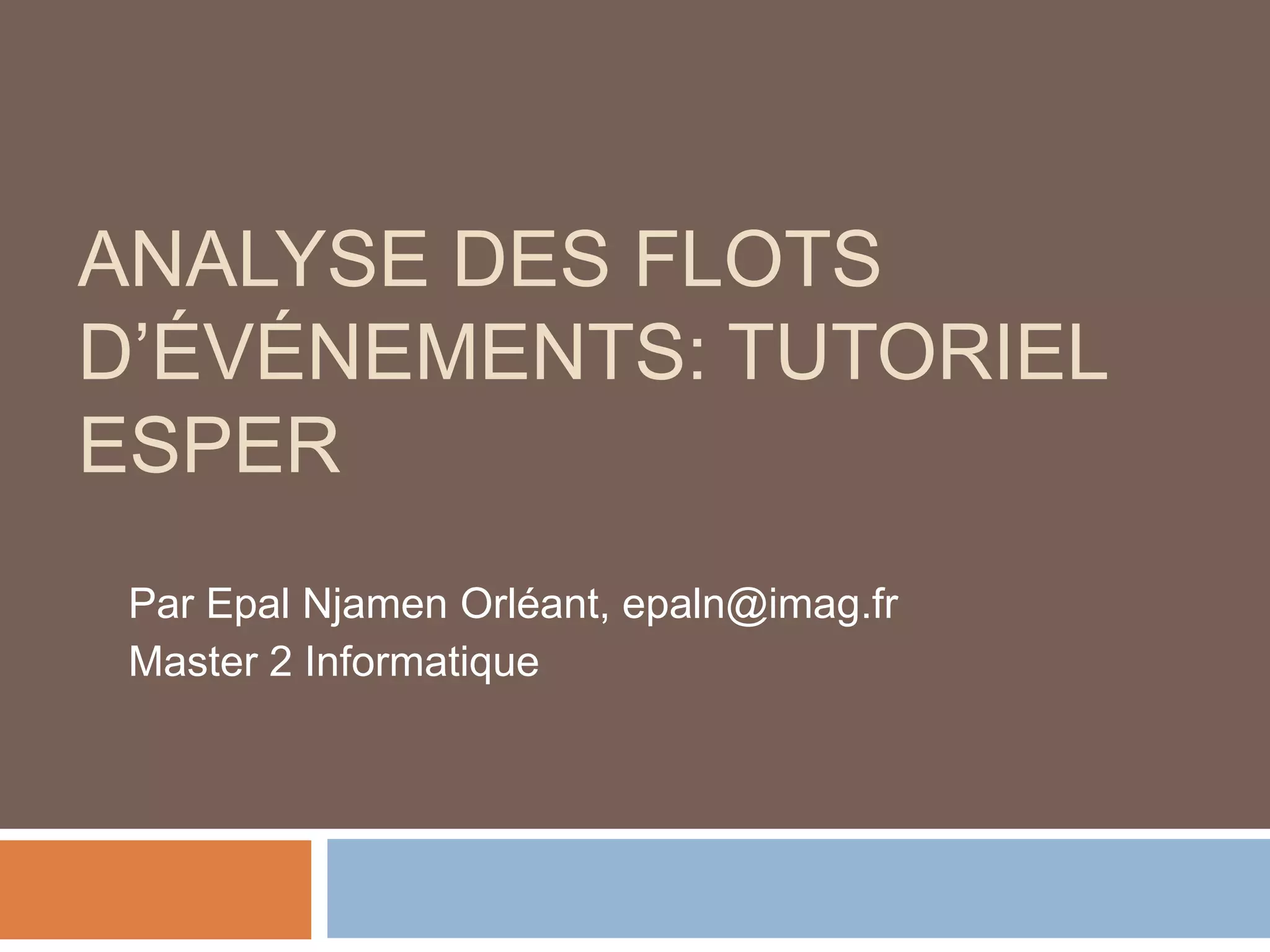 Le document présente un tutoriel sur l'analyse des flots d'événements, en utilisant Esper pour permettre aux habitants d'une ville intelligente de recevoir des notifications basées sur des événements pertinents à leurs besoins. Il décrit des concepts tels que la production et la consommation d'événements, les types d'événements, et présente des requêtes d'exemple pour détecter des actions spécifiques. La conclusion indique que le prochain focus sera sur la distribution de l'analyse des flux d'événements sur plusieurs machines.