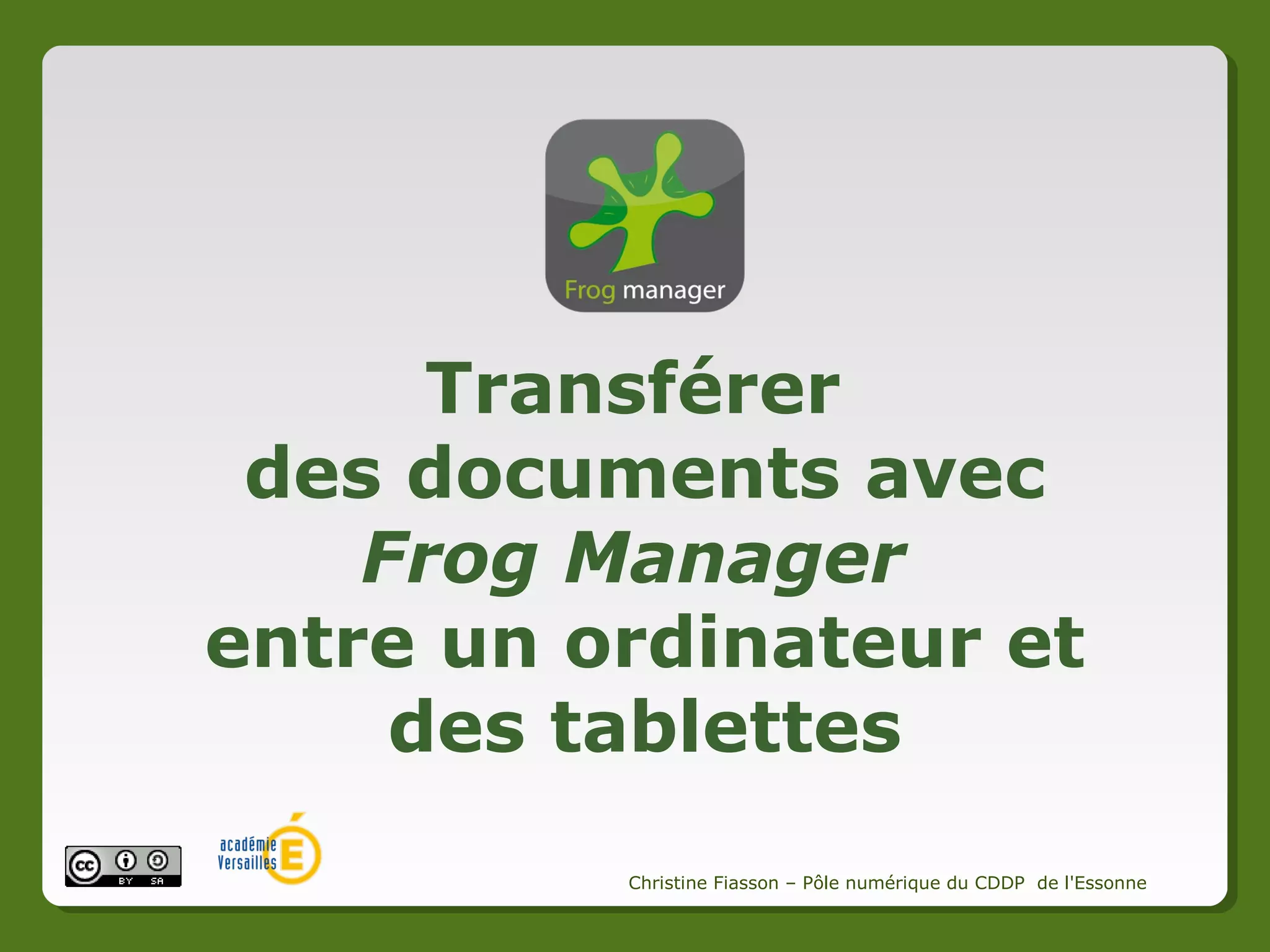 Le document présente le logiciel Frog Manager qui permet de transférer des fichiers entre un ordinateur et des tablettes tactiles, en nécessitant l'installation de l'application sur les appareils. Il détaille les étapes à suivre pour lancer le logiciel, identifier les tablettes, connecter les appareils, ainsi que les procédures pour envoyer et récupérer des fichiers pendant une heure de cours. Des conseils pour organiser efficacement le travail en classe avec ce logiciel sont également fournis.