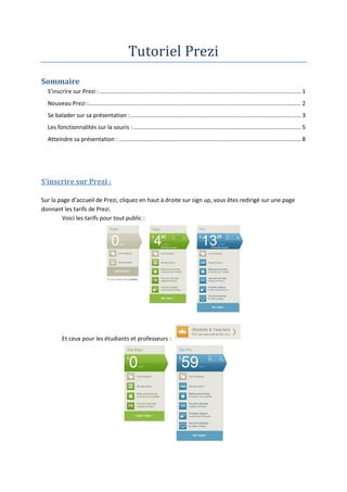 Le document est un tutoriel détaillé expliquant comment s'inscrire et créer une présentation sur Prezi, ainsi que les différentes fonctionnalités disponibles. Il couvre les étapes pour se déplacer dans la présentation, utiliser les outils d'édition, et lancer la présentation finale. Le tutoriel inclut également des conseils pour optimiser l'organisation des diapositives et les interactions avec les éléments de la présentation.