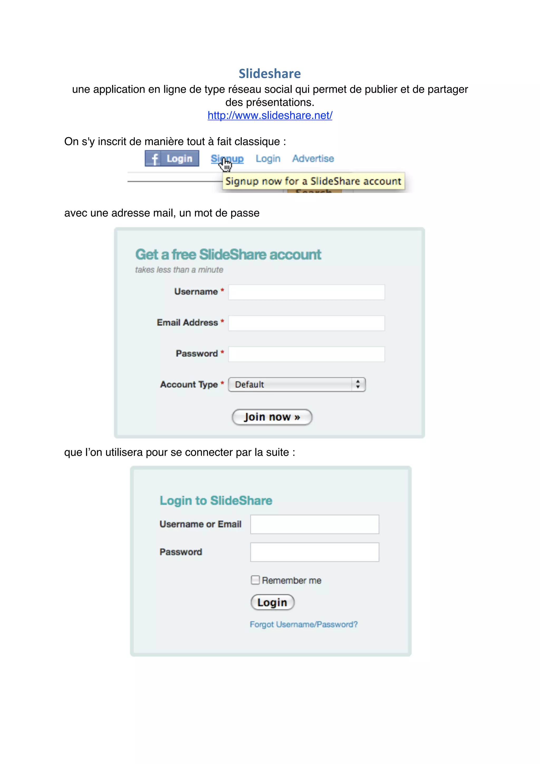 Slideshare est une plateforme de partage de présentations où les utilisateurs peuvent publier divers formats de documents tels que PDF et PowerPoint. Les utilisateurs ont la possibilité de configurer la confidentialité de leurs documents, en les rendant publics ou en limitant leur visibilité à des amis. Il permet également d'interagir avec d'autres utilisateurs par des commentaires et des likes, et offre la possibilité d'intégrer des diaporamas sur des sites web.