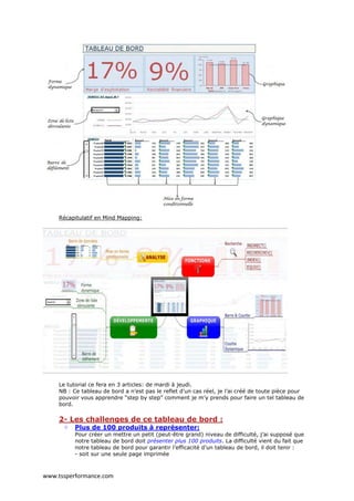 Ce document présente un tutoriel sur la création d'un tableau de bord dans Excel, réparti en plusieurs articles. Il décrit les étapes fondamentales pour organiser les données, créer des graphiques dynamiques et utiliser des éléments comme des formes, des listes déroulantes et des mises en forme conditionnelles. À la fin de chaque article, des fichiers Excel associés sont proposés pour aide à l'apprentissage pratique.