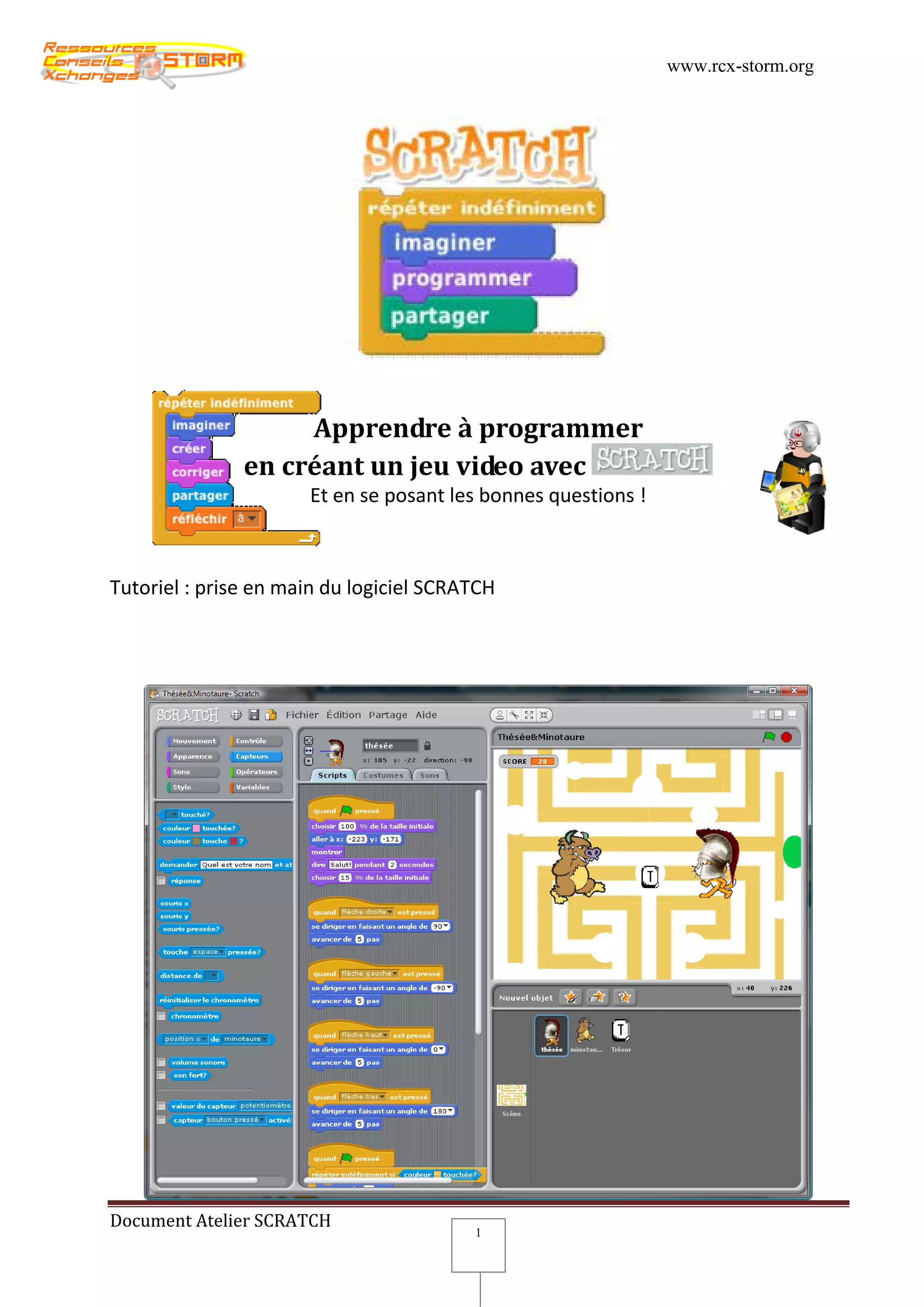 Le document présente une initiative éducative visant à initier les jeunes à la robotique et à la programmation par le biais de la création de jeux vidéo avec le logiciel Scratch. Il explique étape par étape le processus de développement d'un jeu intitulé 'Thésée et le Minotaure', tout en enseignant des concepts de base en programmation de manière interactive et ludique. Les participants sont encouragés à participer à des défis internationaux après une initiation à la construction et à la programmation de robots Lego Mindstorms.