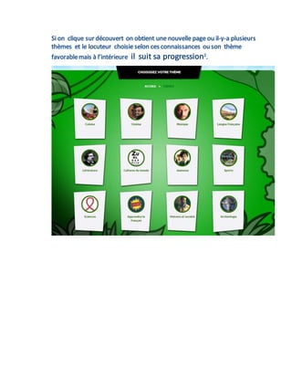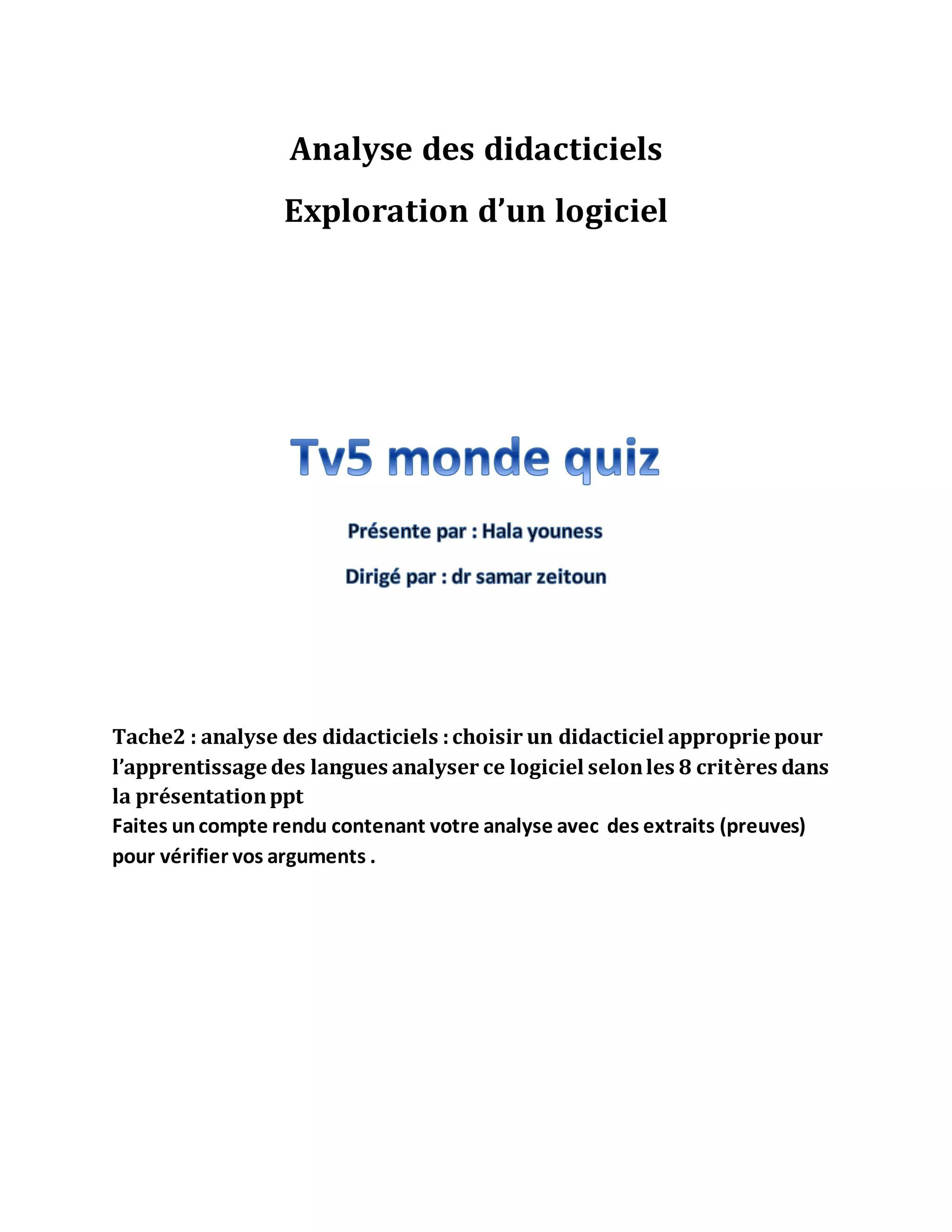 L'analyse des didacticiels porte sur le choix d'un logiciel adapté pour l'apprentissage des langues, en se basant sur huit critères d'évaluation. Le logiciel examiné, TV5 Monde Quiz, vise à enseigner le français à travers divers thèmes, utilisant des questions à choix multiples et un système de classement des joueurs. Un compte rendu doit inclure des extraits pour soutenir les arguments présentés.