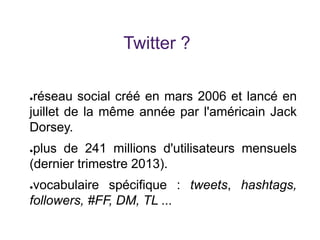 Twitter est un réseau social de microblogging lancé en 2006 par Jack Dorsey, comptant plus de 241 millions d'utilisateurs mensuels en 2013. Il permet la création et publication de contenus courts limités à 140 caractères, favorisant une communication rapide sur divers sujets. Les usages de Twitter incluent la veille informationnelle, l'échange de connaissances et des pratiques pédagogiques innovantes.