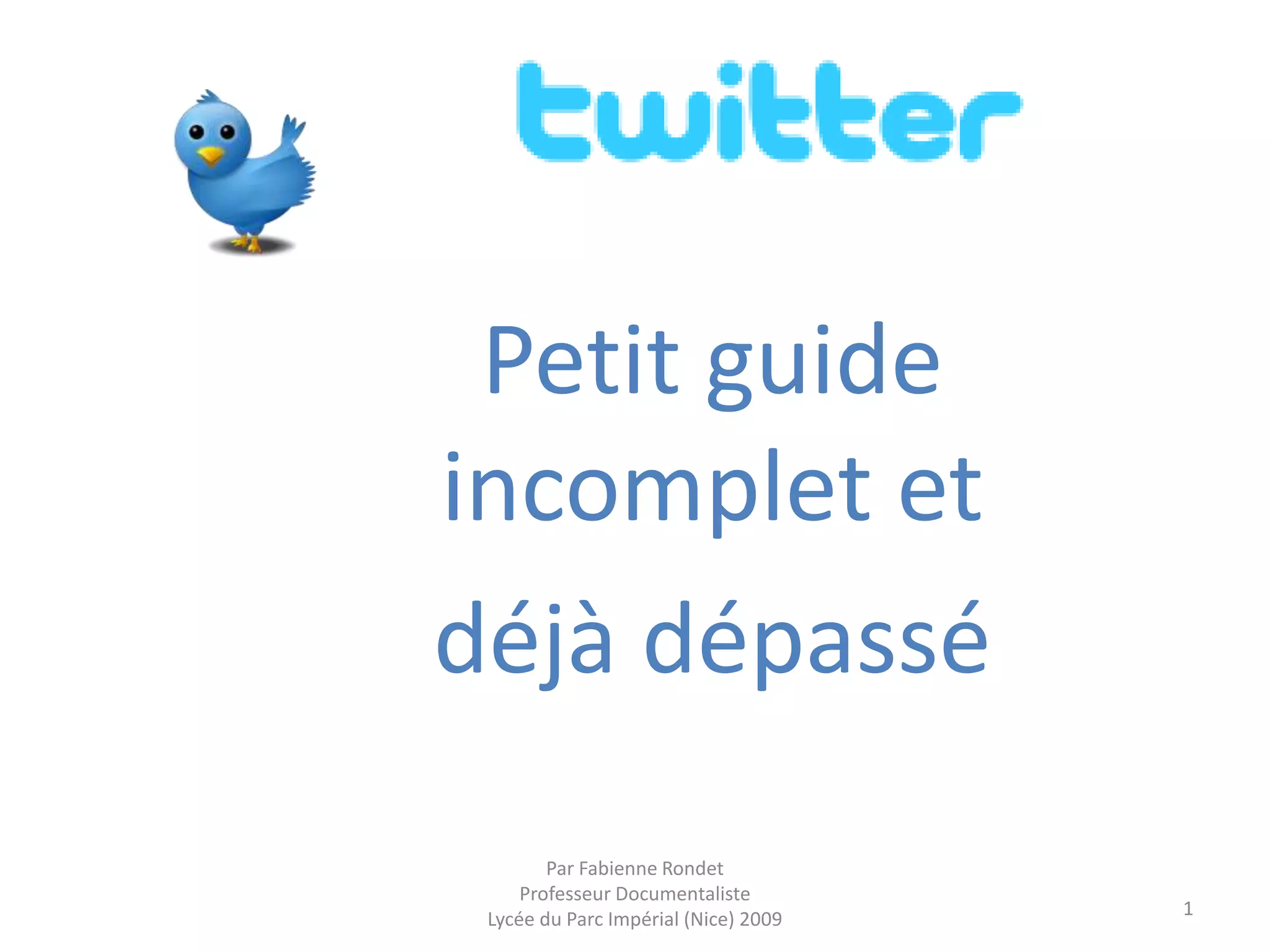 Twitter, lancé en 2006 par Jack Dorsey et Noah Glass, est un réseau social axé sur la diffusion d'informations via des messages courts appelés tweets. Pour les professeurs documentalistes, il sert d'outil de veille et de communication, permettant de suivre des institutions et de partager des informations. Le guide fournit également des instructions sur la création d'un compte, l'écriture de messages, et l'utilisation de fonctionnalités comme le retweet et les hashtags.