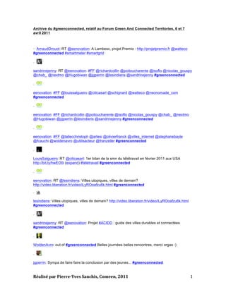 Le document est une archive des échanges autour du forum 'green and connected territories' qui a eu lieu les 6 et 7 avril 2011, incluant des discussions sur des projets liés à la durabilité et à la connectivité des villes. Il présente divers projets et initiatives comme les smart meters et les écocentres, ainsi que l'importance de l'exemplarité des collectivités dans le développement du télétravail. Le forum a suscité des dialogues sur la réduction des consommations d'énergie et l'impact des technologies de l'information et de la communication (TIC) sur le développement durable.