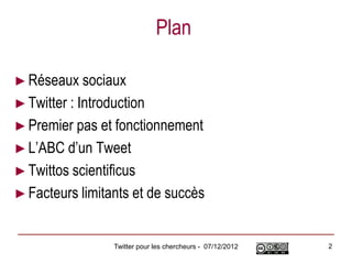 Le document présente les avantages et les fonctionnalités de Twitter pour les chercheurs, en soulignant son potentiel pour la communication scientifique et la création de réseaux de collaboration. Il aborde des thèmes tels que la création de comptes, la manière d'écrire des tweets efficaces, et l'utilisation de Twitter pour partager des recherches et suivre des conférences. Des recommandations sont également fournies sur la gestion des abonnés et la valorisation de la recherche à travers des interactions sur la plateforme.