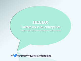 Ce document présente Twitter comme un outil essentiel pour les entreprises, les marques et les personnalités publiques, permettant de promouvoir, communiquer et dialoguer avec leur audience. Il décrit des pratiques optimales pour l'utilisation de Twitter, ainsi que l'importance des hashtags et des interactions en temps réel. Enfin, il fournit des exemples d'applications pratiques et souligne comment Twitter peut améliorer la visibilité et la réputation en ligne.