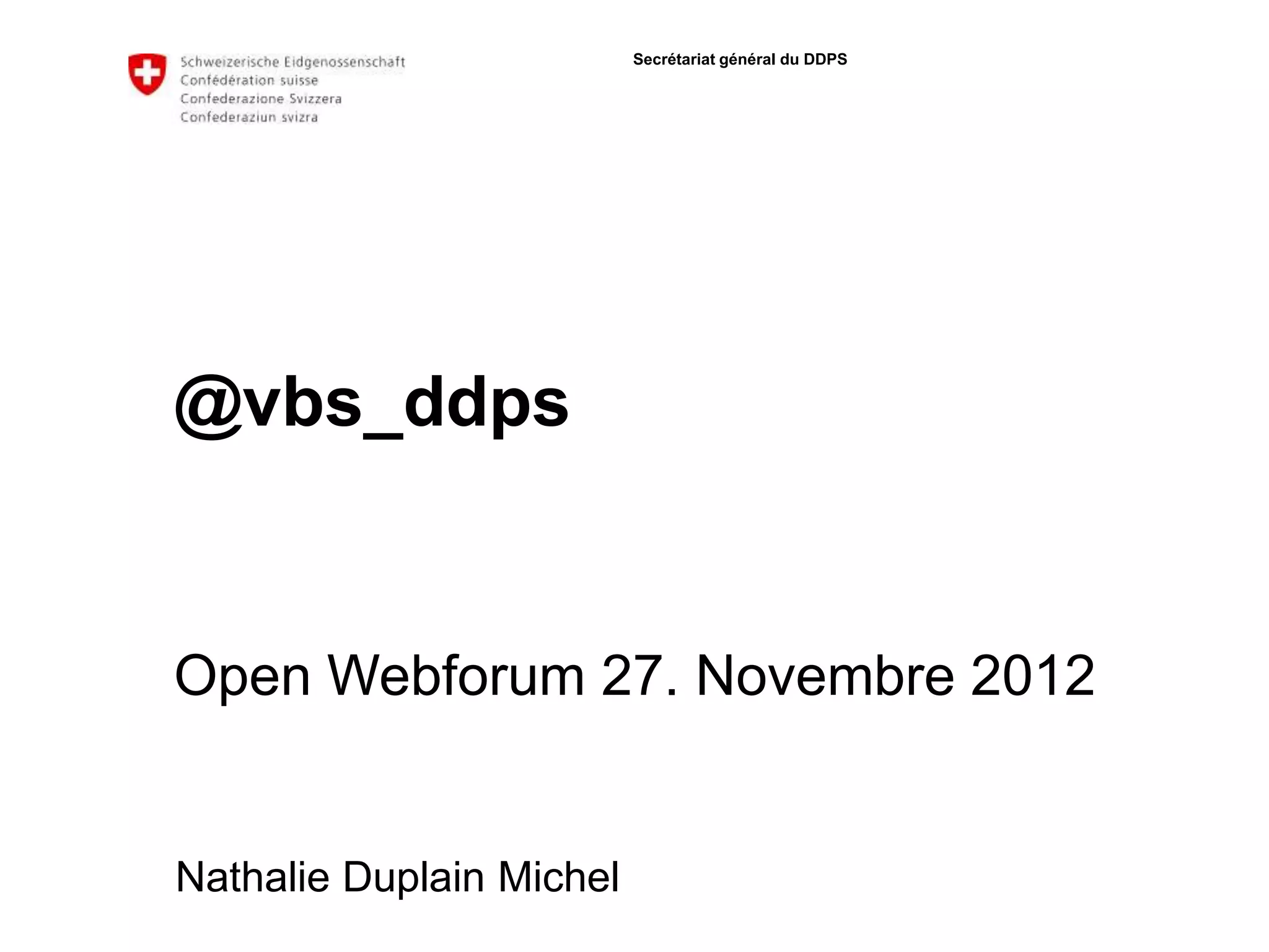 Le document présente un webforum du secrétariat général du DDPS organisé par Nathalie Duplain Michel, axé sur l'expérience des médias sociaux au DDPS. Il détaille l'ouverture d'un compte Twitter en août 2012, les objectifs de communication, les contenus publiés, ainsi que les leçons apprises et les projets futurs liés aux médias sociaux. Des défis tels que le monitoring et la planification des publications sont soulignés, tout en exprimant l'intention d'ouvrir des comptes Twitter multilingues.