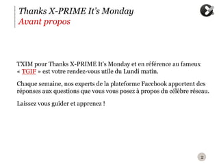 Le document présente des conseils hebdomadaires sur l'utilisation de Facebook pour les marques internationales, en mettant l'accent sur l'homogénéisation de leur présence en ligne. Il aborde la nécessité d'une image de marque unifiée et la personnalisation des contenus selon les différentes versions locales. De plus, il mentionne la gestion des statistiques pour les pages individuelles et globales, accessibles sur demande à un chargé de compte Facebook.