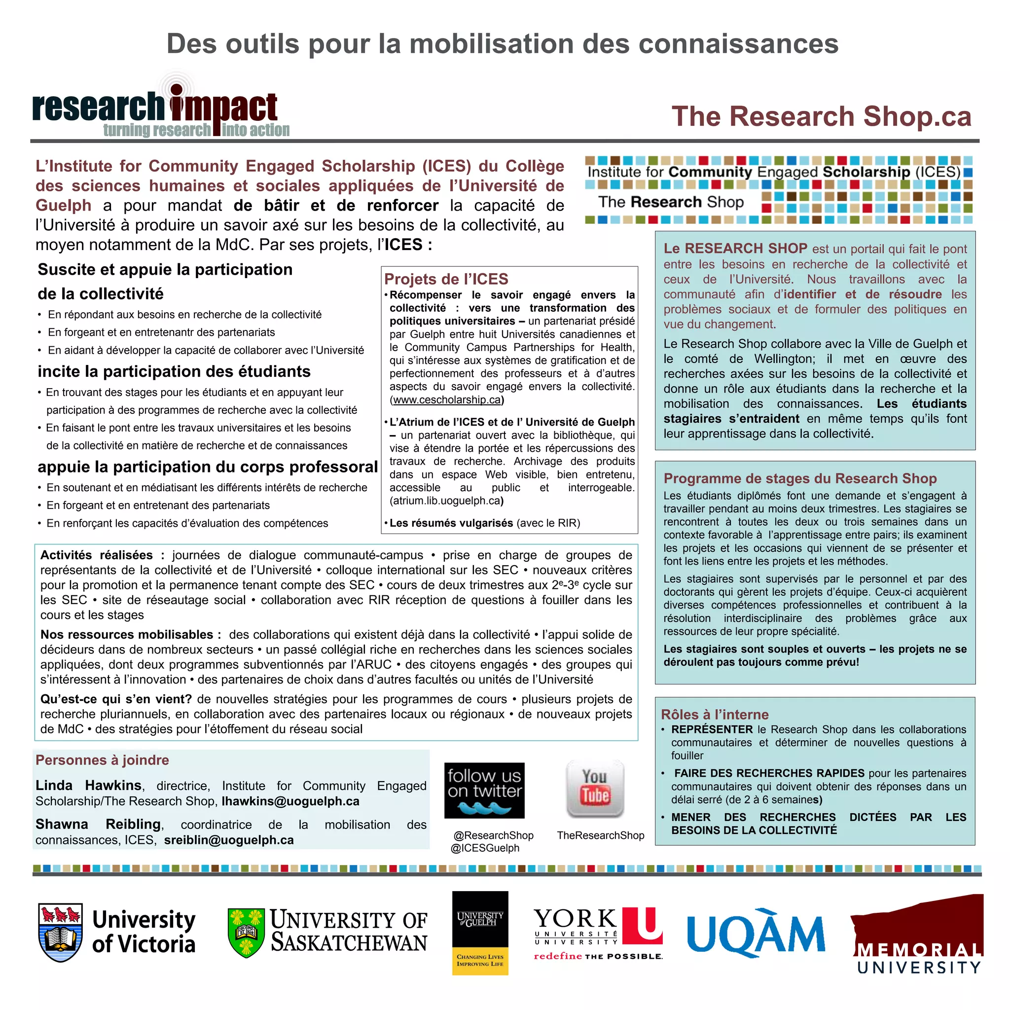 Le Research Shop de l'Institute for Community Engaged Scholarship de l'Université de Guelph a pour mission de relier les besoins de recherche de la collectivité avec les projets universitaires. Il soutient la participation des étudiants à des recherches axées sur les besoins communautaires et favorise des partenariats entre l'université et divers acteurs locaux. Les initiatives comprennent l'organisation de dialogues entre la communauté et le campus, des stages pour les étudiants et des projets de recherche collaboratifs.