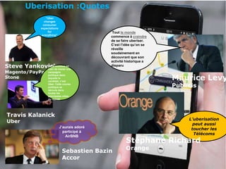 L'uberisation est un phénomène de transformation économique qui modifie les modèles traditionnels d'emploi et de consommation grâce aux technologies numériques. Elle impacte divers secteurs, notamment le transport, l'hôtellerie et le journalisme, entraînant une réduction de l'importance des intermédiaires et un changement vers une économie de partage. Un rapport estime que l'uberisation pourrait affecter jusqu'à 14% des emplois, mettant en avant la transition vers une économie de petits boulots et de travail indépendant.