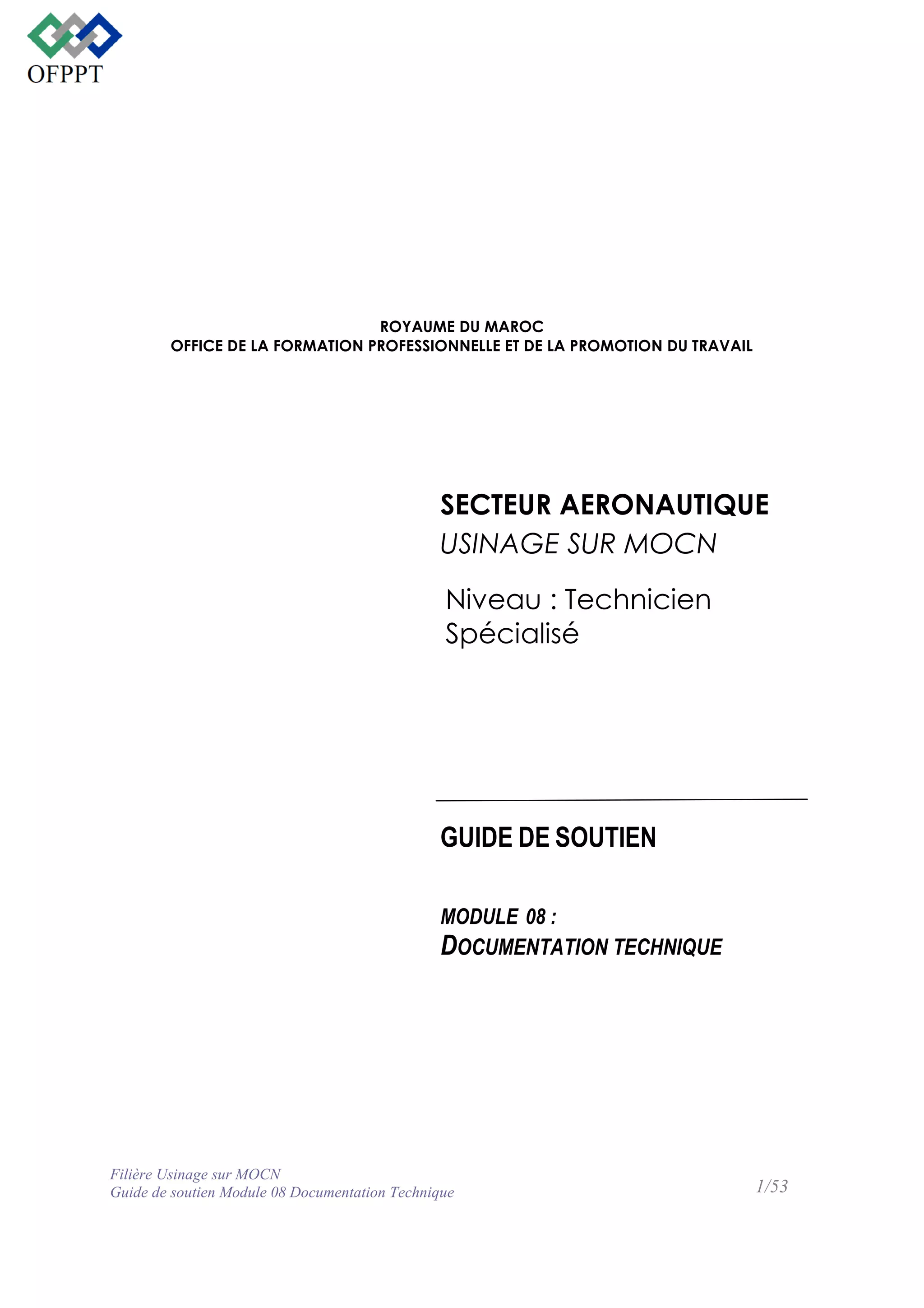 Le document est un guide technique pour la formation des techniciens spécialisés en usinage sur MO-CN au Maroc, portant sur la lecture de plans, les coupes et sections, ainsi que les spécifications géométriques et dimensionnelles. Il aborde des concepts fondamentaux comme les projections orthogonales, les coupes, les tolérances dimensionnelles et les erreurs de forme. Ce guide fournit également des normes et des indications spécifiques pour le dessin technique dans le secteur aéronautique.