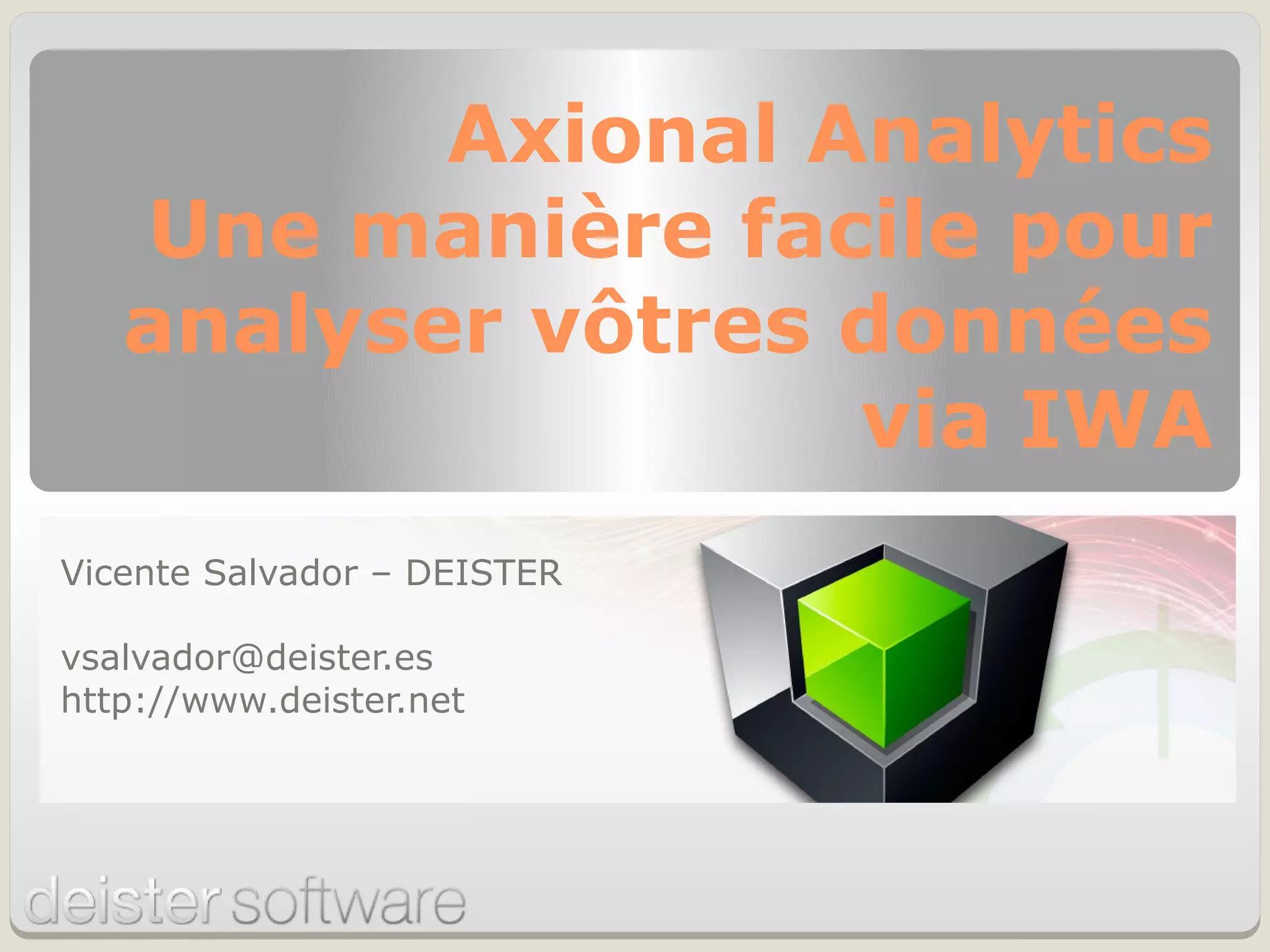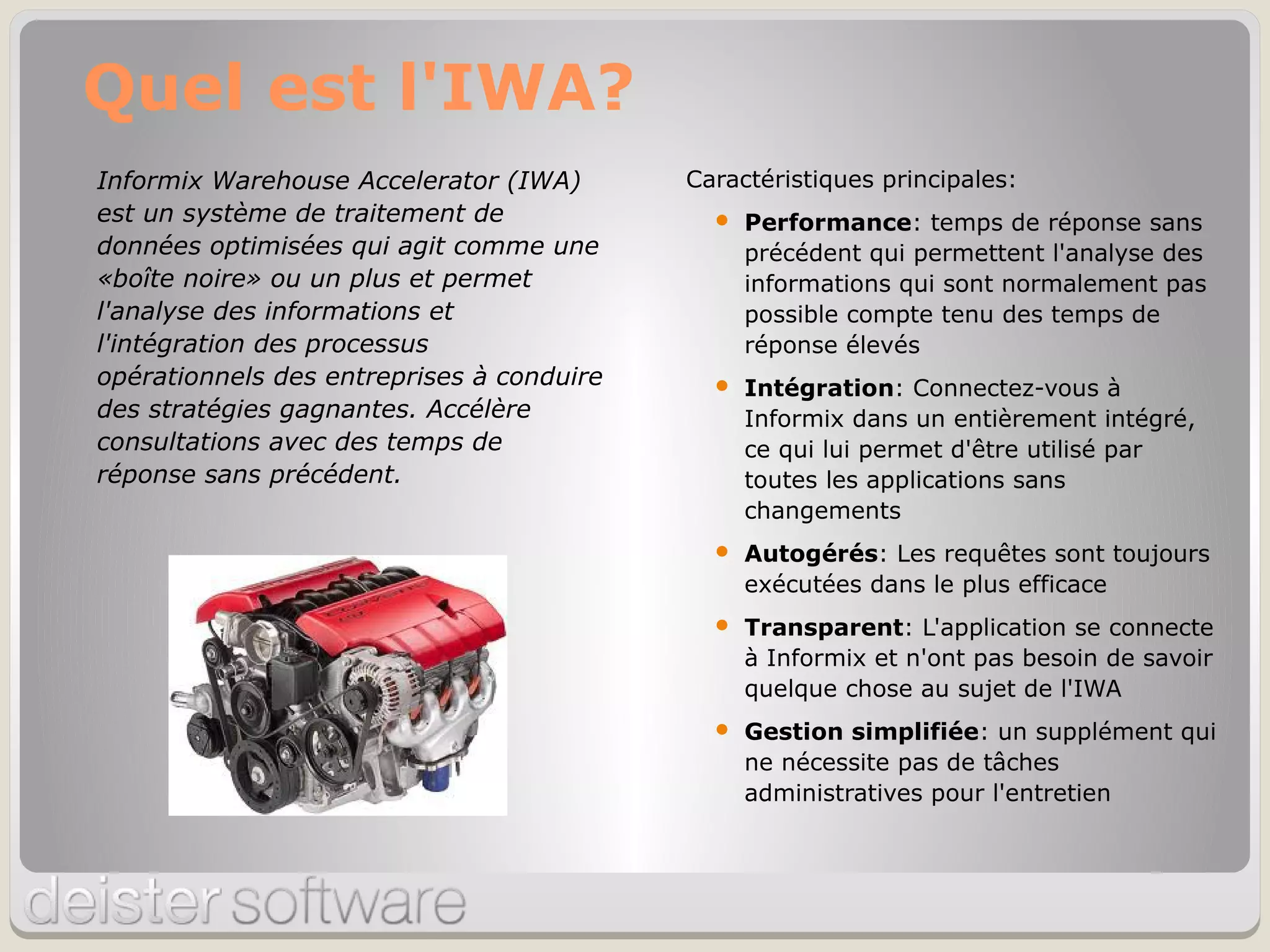 L'Informix Warehouse Accelerator (IWA) est un système permettant une analyse efficace des données, offrant des temps de réponse rapides et une intégration transparente avec Informix. Il optimise l'exécution des requêtes SQL et simplifie la gestion des processus analytiques grâce à des fonctionnalités avancées et des outils flexibles pour le traitement des données. Axional Analytics se positionne comme une solution complète pour l'intégration et l'analyse des données, adaptée aux besoins variés des entreprises.
