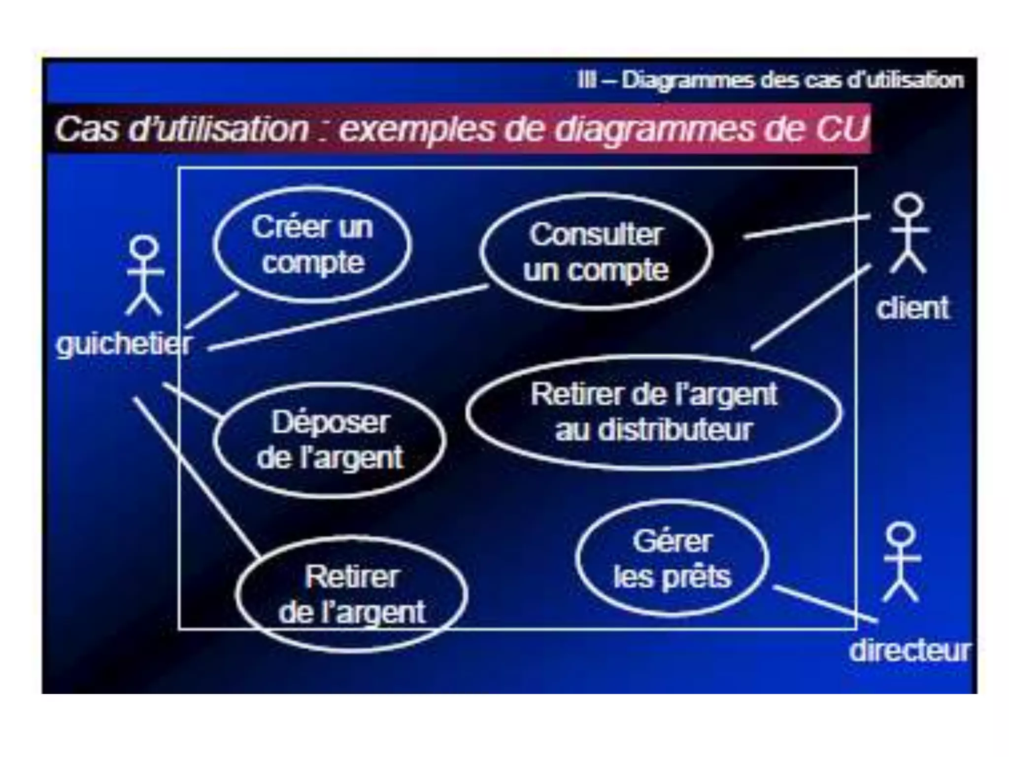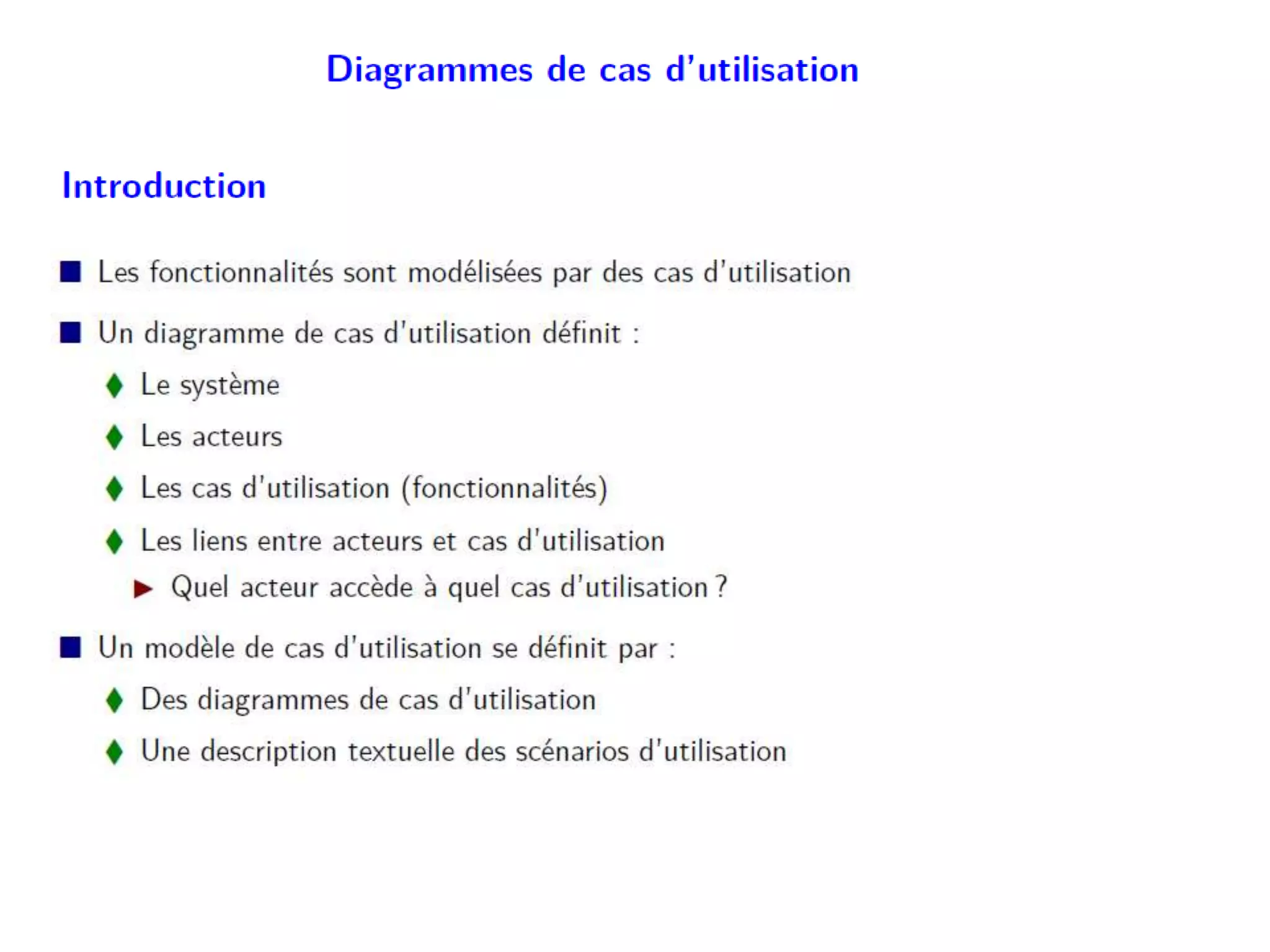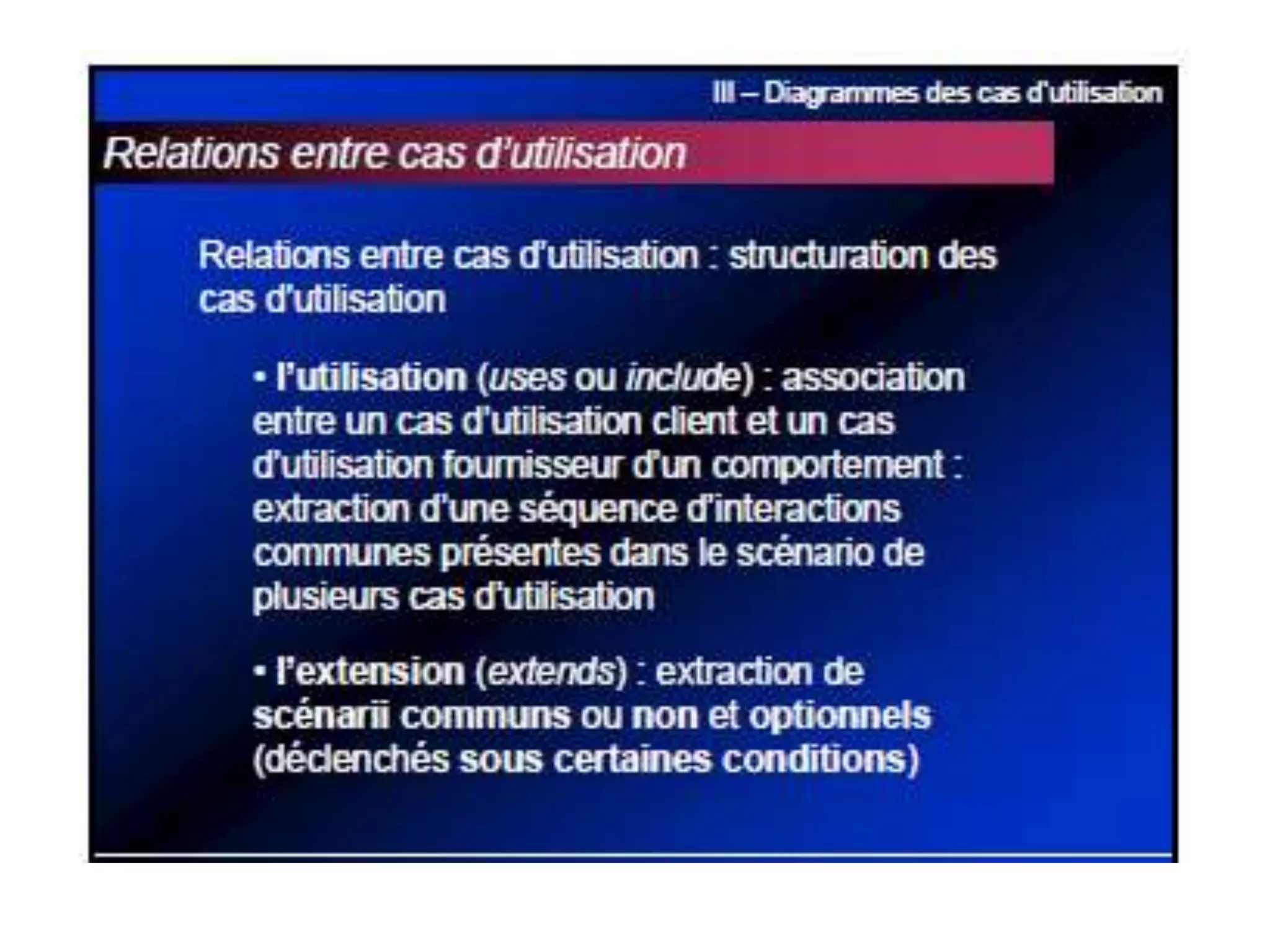 La conception de logiciels avec UML utilise des modèles pour résoudre des problèmes à travers divers diagrammes, répartis selon trois axes : fonctionnel, structurel et dynamique. Les diagrammes incluent les cas d'utilisation, les diagrammes de classes et d'états, chacun représentant différentes interactions et structures au sein du système. Les relations entre cas d'utilisation, telles que 'include' et 'extend', ainsi que les concepts d'agrégation et de composition, sont également détaillés pour décrire les interactions et la hiérarchie des éléments du système.