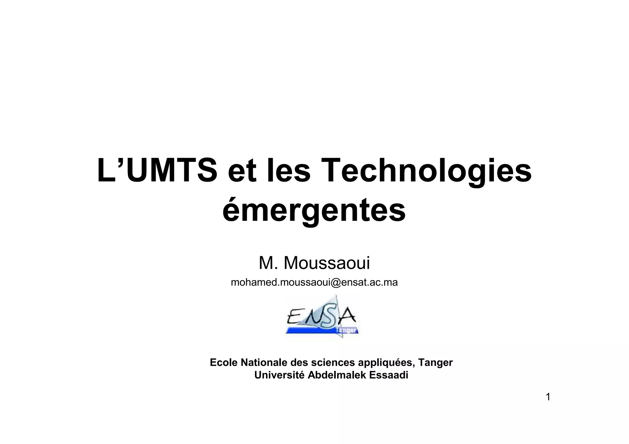 Le document traite des évolutions des systèmes de téléphonie cellulaire, en se concentrant sur l'évolution vers les réseaux UMTS (Universal Mobile Telecommunications System) et leur standardisation par l'UIT. Il aborde les objectifs des UMTS, notamment la compatibilité avec les systèmes de deuxième génération, le support multimédia et les débits de communication. Enfin, il décrit l'architecture des réseaux GSM et UMTS, ainsi que les classes de services définies pour ces systèmes.
