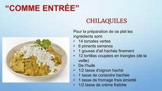 Le document présente un ensemble de recettes pour un brunch du dimanche, incluant des plats comme les chilaquiles, la soupe de riz, la salade niçoise et des omelettes, ainsi que des boissons comme le café et le thé. Chaque recette est accompagnée d'une liste d'ingrédients spécifiques. En outre, il inclut également des options de desserts tels que le riz au lait et la tarte au fromage.