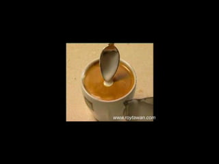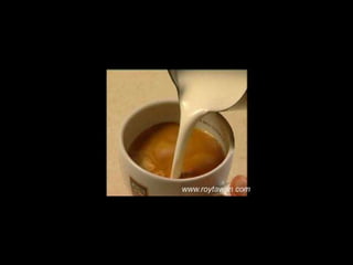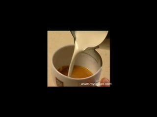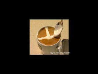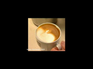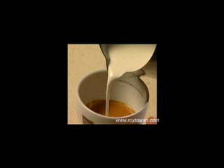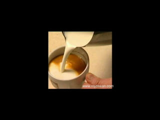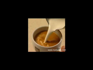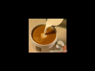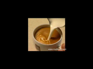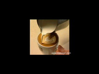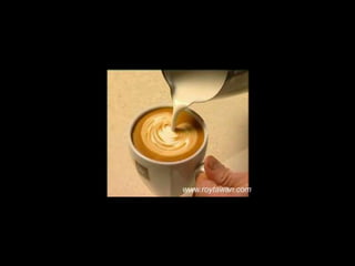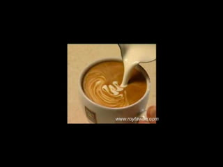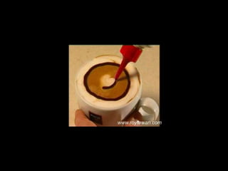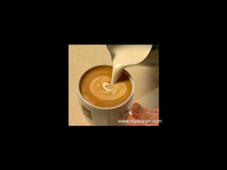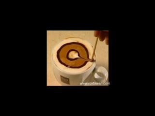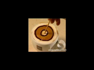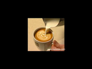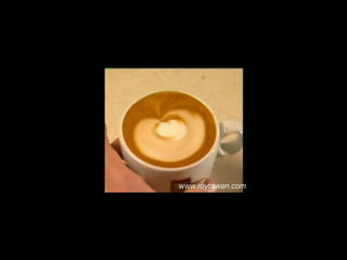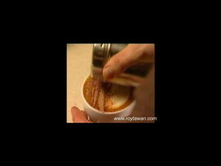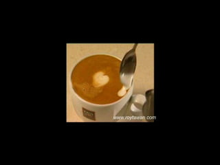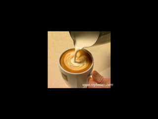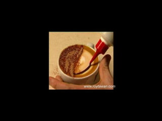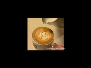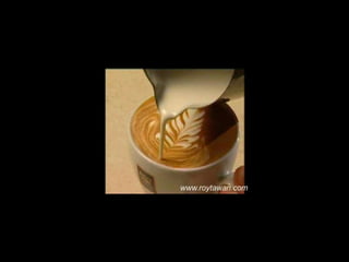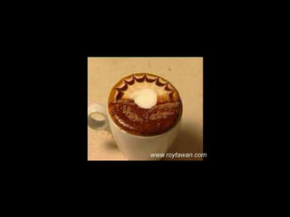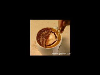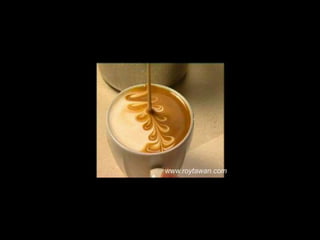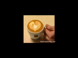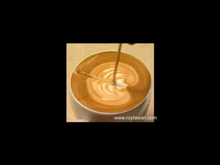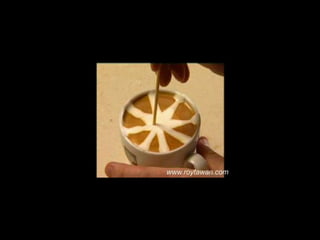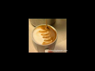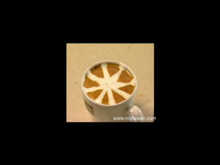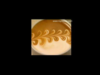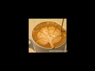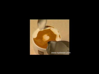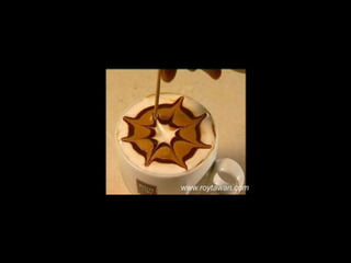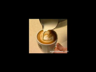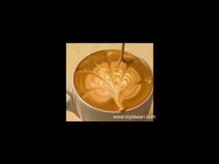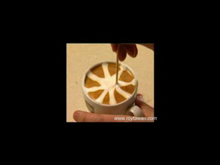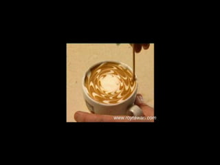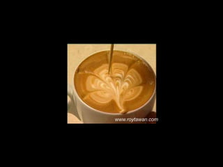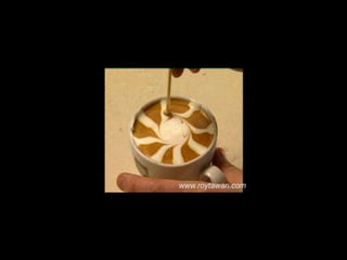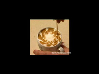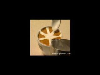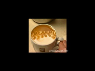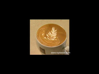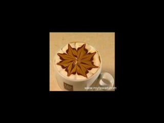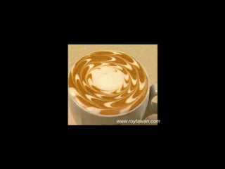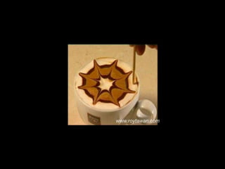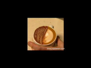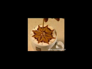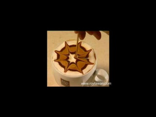 Le document propose des idées originales pour préparer un café au lait. Il mentionne des thèmes variés tels que des motifs comme l'étoile, le coucher de soleil, et la rose. Des photos sont également référencées depuis le site www.roytawan.com.