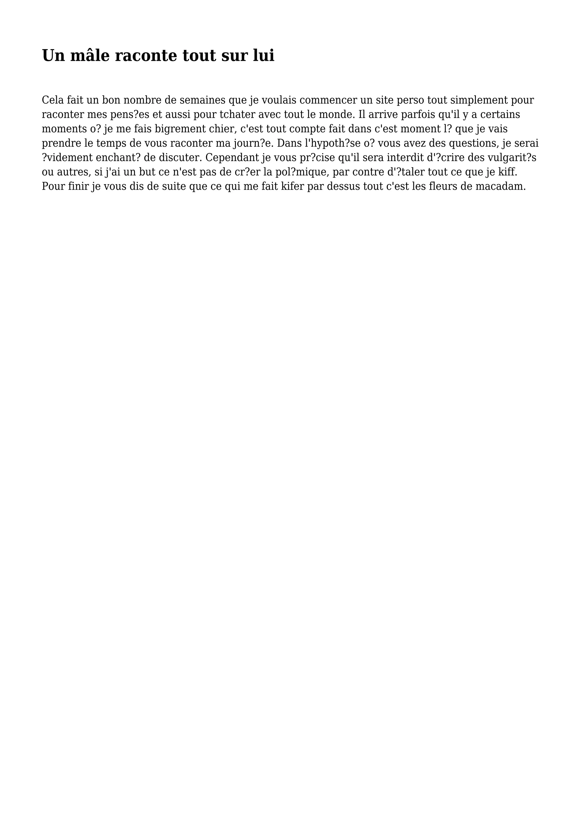 Un homme souhaite créer un site personnel pour partager ses pensées et interagir avec d'autres. Il prévoit de raconter ses journées, principalement durant ses moments d'ennui, tout en interdisant les vulgarités pour éviter les polémiques. Sa passion principale est pour les fleurs de macadam.