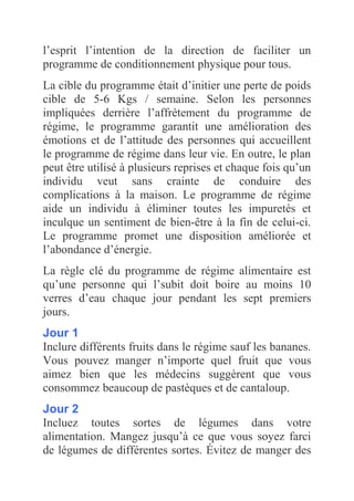 Le programme de perte de poids de General Motors est un régime de sept jours conçu pour aider les employés à perdre 5-6 kg par semaine, approuvé par des chercheurs. Le programme est accessible à tous les employés, favorise une amélioration de l'humeur et du bien-être, et propose un régime alimentaire spécifique jour après jour, en insistant sur l'hydratation. Il recommande de faire une pause de trois jours avant de recommencer le cycle.