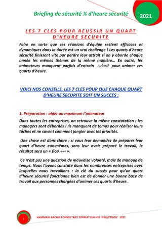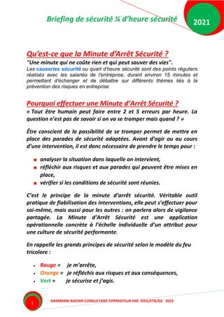 Le document traite des causeries sécurité, également appelées quarts d’heure sécurité, qui permettent de discuter des risques et de la prévention des accidents au travail avec les employés. Il expose les principales pratiques pour animer ces réunions de manière efficace, y compris la préparation, l'engagement des participants et la diversification des thèmes abordés. En soulignant l'importance de l'implication des managers et de la formation adéquate, il met l'accent sur la nécessité de transformer ces moments en échanges participatifs et non en simples rappels de règles.