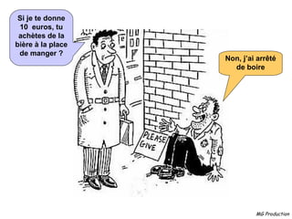 Une conversation humoristique aborde des sujets tels que l'argent, la consommation d'alcool et les loisirs, où un homme refuse de donner de l'argent pour de la nourriture. Au lieu de cela, il propose un repas chez lui pour montrer à un ami les effets de l'abstinence. Le dialogue souligne les priorités et les choix de vie des personnages.