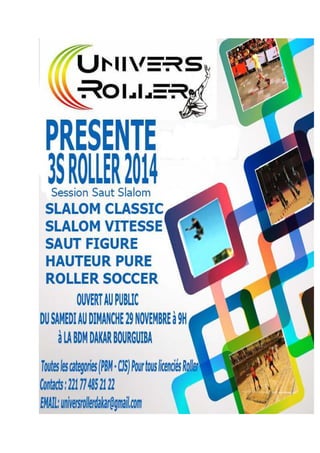 L'association Univers Roller organise la première édition de la session saut et slalom les 28 et 29 novembre 2014 à Dakar, promouvant les disciplines de roller. L'événement inclut des compétitions de freeride et slalom, rassemblant plus de 100 participants, avec des catégories pour tous les âges. En plus des compétitions, des activités et des animations seront organisées pour sensibiliser le public aux arts de la rue et à la sécurité dans la pratique du roller.