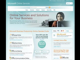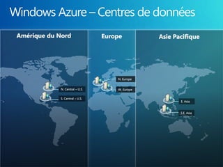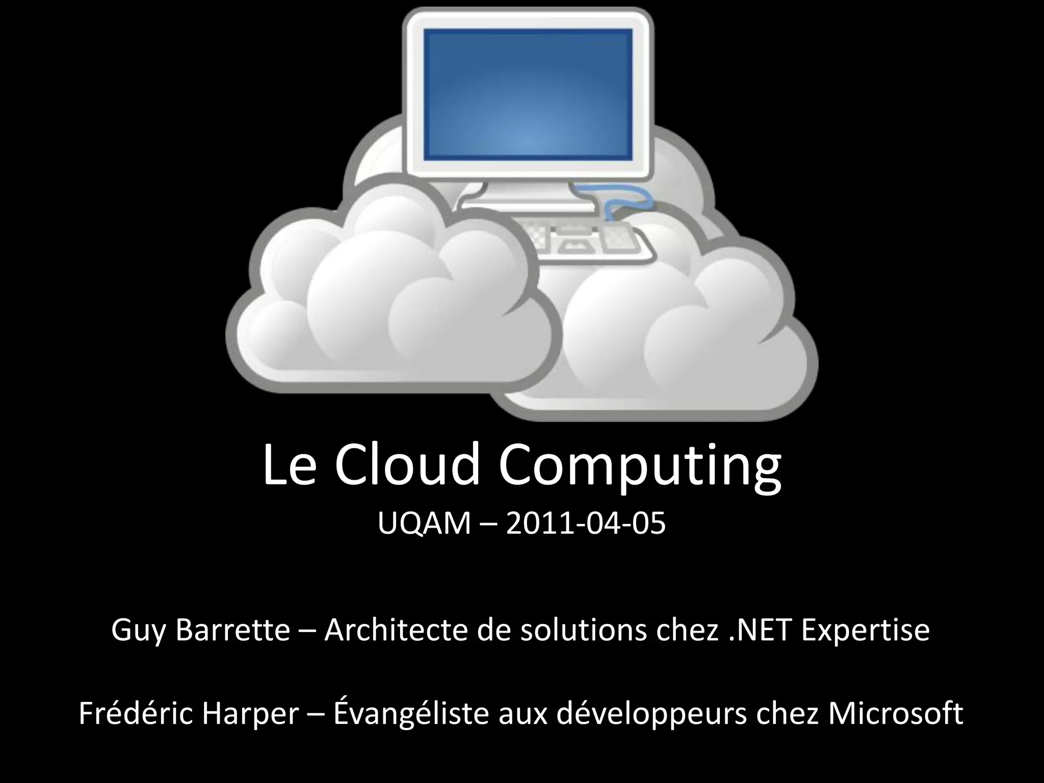 Ce document présente une discussion sur le cloud computing, mettant en avant les différents types de services tels que l'IaaS, PaaS et SaaS. Il aborde également les avantages du cloud, comme la réduction des coûts et l'amélioration du time-to-market, ainsi que le programme BizSpark de Microsoft qui soutient les startups avec des ressources et des outils essentiels. Les intervenants de la présentation sont Guy Barrette et Frédéric Harper.