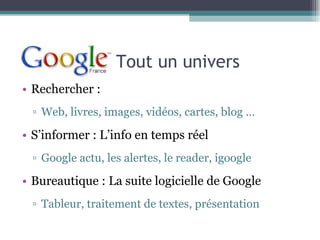 Le document présente des outils et méthodes pour intégrer le multimédia dans un projet d'animation, en mettant l'accent sur la recherche d'information via divers supports comme le web, les livres et les images. Il décrit les étapes pour effectuer une recherche efficace en utilisant Google et d'autres ressources en ligne. En outre, il souligne l'importance d'utiliser des outils bureautiques en ligne pour organiser l'information.