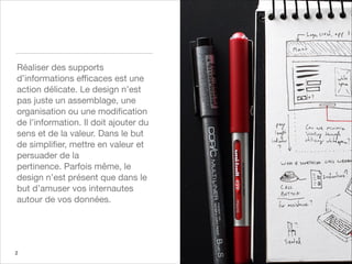 Le document traite des principes fondamentaux du design de l'expérience utilisateur (UX), soulignant l'importance d'une approche centrée sur l'utilisateur pour concevoir des interfaces claires et efficaces. Il présente également quinze principes clés, tels que l'interaction, la clarté, et la hiérarchisation, qui visent à améliorer la compréhension et l'engagement des utilisateurs. En fin de compte, le design n'est pas seulement esthétique, mais doit également remplir une fonction utilitaire pour répondre aux besoins des utilisateurs.