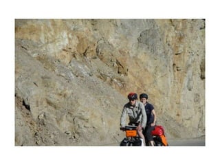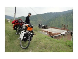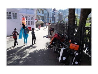Le document décrit un itinéraire de voyage à vélo en Inde, reliant des villes et cols majeurs de l'Himalaya en raison de l'impossibilité d'accéder au Tibet. Il mentionne des difficultés rencontrées, notamment la réparation d'un tandem et des glissements de terrain affectant les routes. Les déplacements en bus et en jeep sont également mentionnés pour contourner les problèmes sur le trajet.