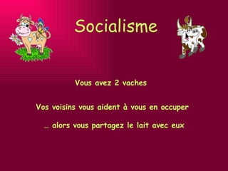 Le document utilise la métaphore des vaches pour illustrer divers systèmes politiques et économiques, tels que le socialisme, le capitalisme et la démocratie, en mettant en évidence les dynamiques de pouvoir et les implications sociales de chaque système. Chaque description humoristique souligne les différences dans la gestion des ressources et les droits individuels. À travers des exemples variés, l'auteur critique les inefficacités et contradictions présentes dans ces systèmes.
