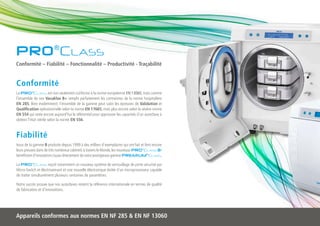 La pro®class b+ est un autoclave conforme aux normes européennes NF 13060 et NF 285, offrant des innovations en matière de sécurité et de fonctionnalité. Adapté à divers types de stérilisation avec sa capacité de 17 à 30 litres, il permet de traiter efficacement différents instruments médicaux. Son système de traçabilité permet une gestion simplifiée et conforme aux exigences réglementaires, rendant cet appareil performant et fiable dans le milieu médical.