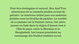 Box and Tree propose de la vaisselle jetable fabriquée à partir de feuilles de palmier areca, récoltées de manière naturelle en Inde. Les assiettes et couverts sont 100% biodégradables et compostables, offrant un choix écologique pour les événements. Ce matériau garantit un rendu naturel et réduit l'impact environnemental.