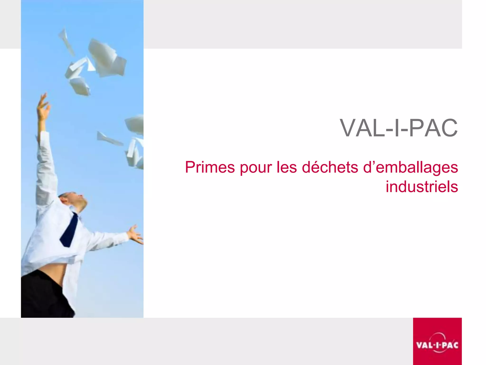 Le document présente les primes offertes par Val-I-Pac pour le tri des déchets d'emballages industriels, incluant des types de primes comme la prime démarrage, la prime conteneur et la prime recyclage. Il décrit les conditions d'obtention et les montants associés, ainsi que les nouvelles obligations liées à la législation bruxelloise. Les entreprises peuvent bénéficier de financements en triant efficacement leurs déchets et en se conformant aux exigences de la nouvelle législation.