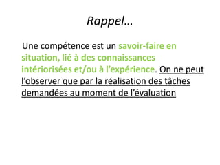 Le document traite de l'évaluation sommative des compétences, mettant l'accent sur la production écrite comme moyen d'évaluer les élèves à travers diverses tâches. Il décrit des niveaux de compétences en écriture selon le CECRL, allant d'expressions simples à des textes élaborés et structurés. Une grille d'évaluation sommative est proposée, basée sur des descripteurs et des objectifs clairs pour les élèves.