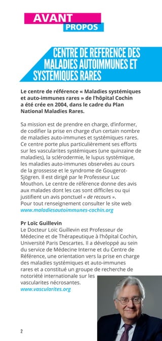 Le document présente un abécédaire sur les vascularites systémiques, abordant leur définition, les différents types de vascularites, leurs causes, ainsi que les méthodes de diagnostic et traitement. Le centre de référence de l'hôpital Cochin se concentre notamment sur ces maladies rares et soutient la recherche et l'information pour les patients. Des informations sur les traitements, y compris l'usage de médicaments spécifiques et les effets secondaires sont également incluses.