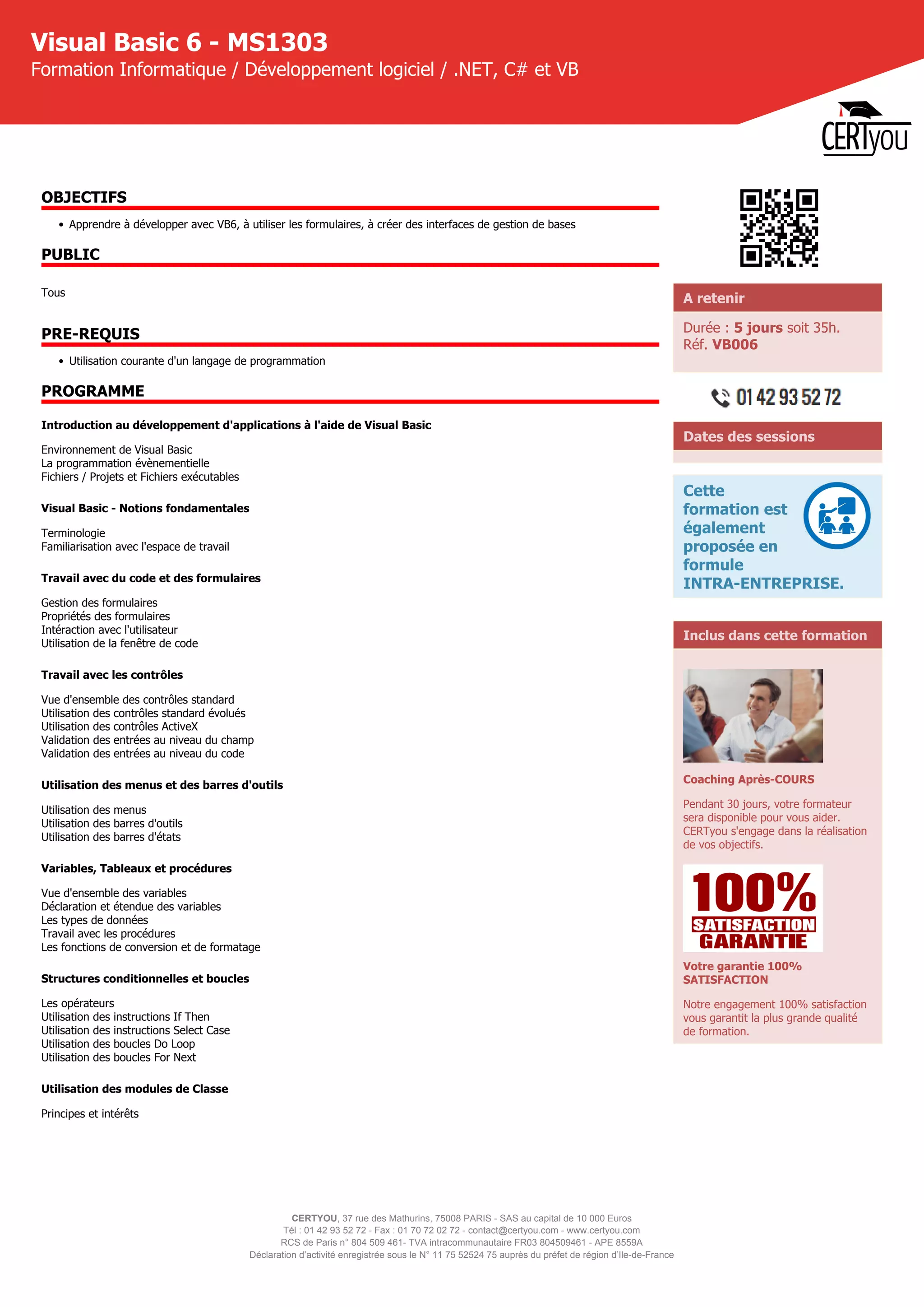 La formation Visual Basic 6 proposée par Certyou, d'une durée de 5 jours, permet d'apprendre à développer des applications à l'aide de cet environnement, en couvrant des sujets tels que la programmation événementielle, la gestion des formulaires, et l'accès aux données. Les participants bénéficieront de coaching après la formation et d'une garantie de satisfaction. Cette formation est également disponible en format intra-entreprise.
