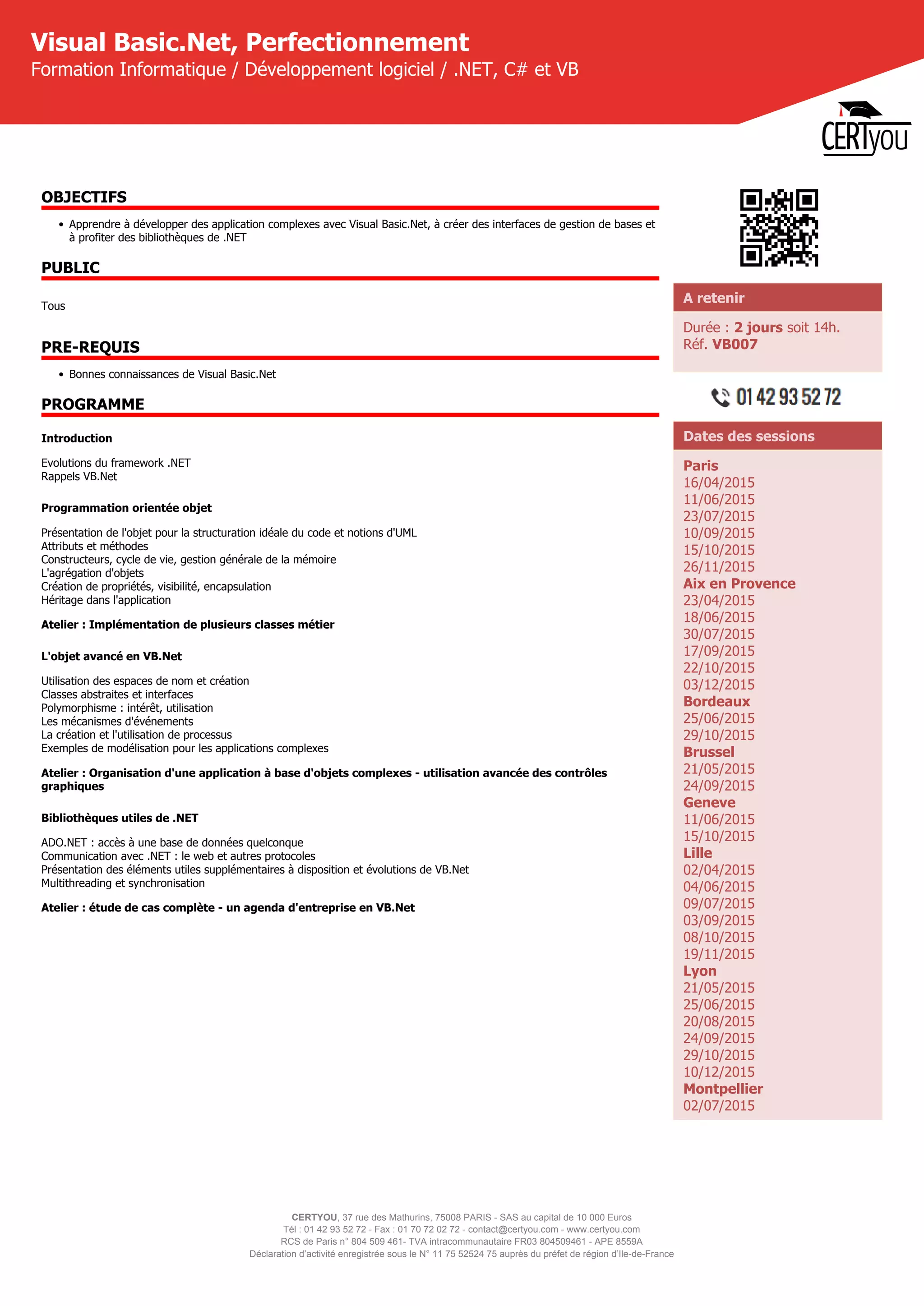 Certyou propose une formation de perfectionnement en Visual Basic.NET sur deux jours pour développer des applications complexes, avec des ateliers pratiques et une étude de cas. Le programme couvre des sujets tels que la programmation orientée objet, l'héritage, et l'accès aux bases de données avec ADO.NET. Les sessions sont disponibles dans plusieurs villes, avec un coaching après-cours inclus et un engagement de satisfaction à 100%.