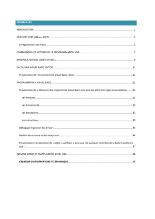 Le document présente un cours d'introduction à la programmation VBA dans Excel, rédigé par Bahi Djedje Laurent Narcisse, qui détaille les concepts fondamentaux de VBA, l'enregistrement de macros, et la manipulation d'objets Excel. Il explique comment créer des applications automatisées à travers des exemples pratiques ainsi que l'importance de maîtriser les objets et leurs méthodes pour optimiser la création de macros. Enfin, il souligne la nécessité de simplifier et de commenter le code généré pour améliorer sa qualité et sa lisibilité.