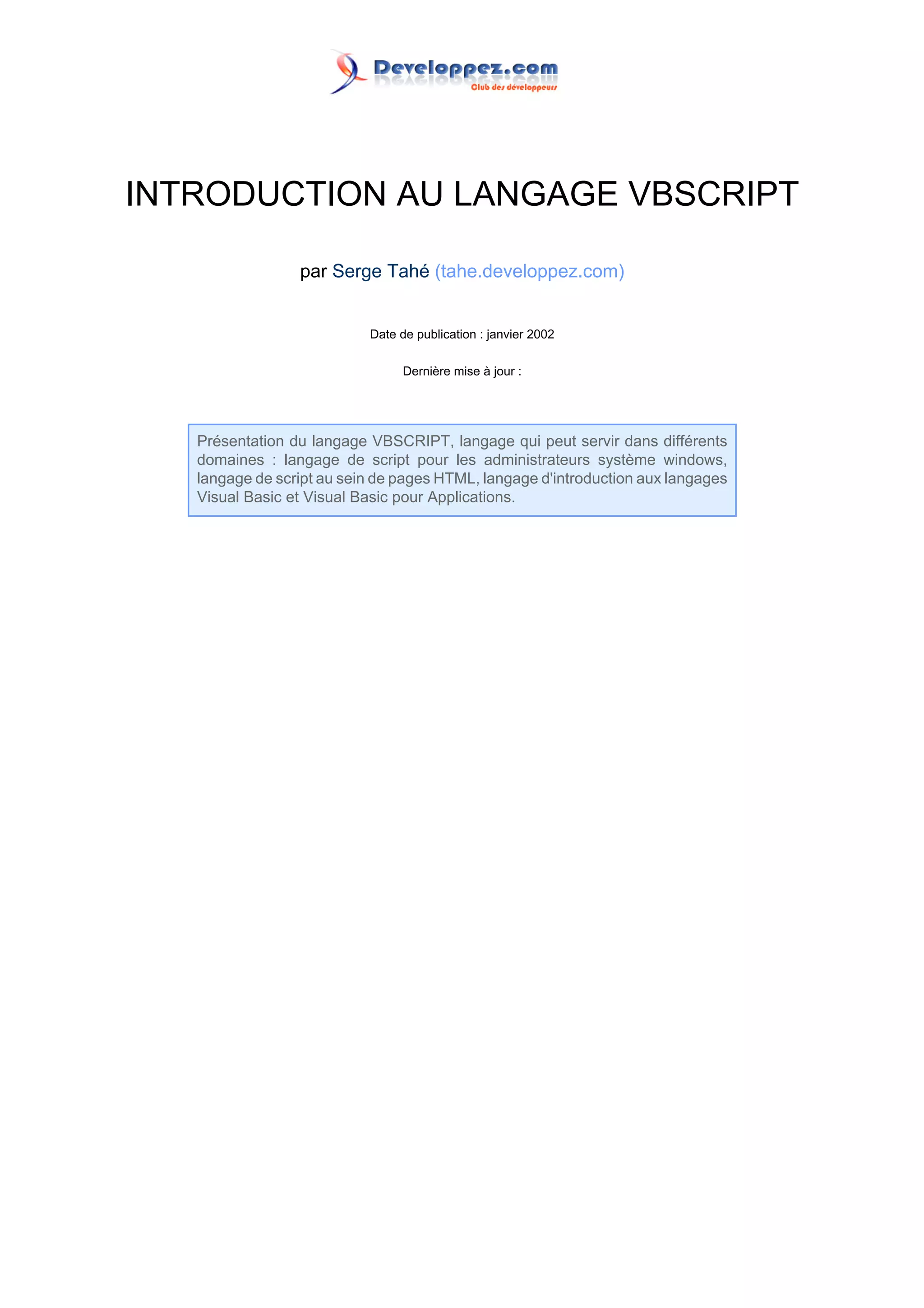 Le document présente une introduction au langage VBScript, expliquant ses différents contextes d'exécution, notamment Windows Scripting Host et Internet Explorer, ainsi que ses applications dans l'administration système et le développement web. Il couvre les bases de la programmation VBScript, y compris la gestion des erreurs, les fonctions et procédures, et l'utilisation de fichiers texte. Finalement, il met en avant la simplicité d'apprentissage du langage et son rôle comme porte d'entrée vers Visual Basic et Visual Basic pour Applications.