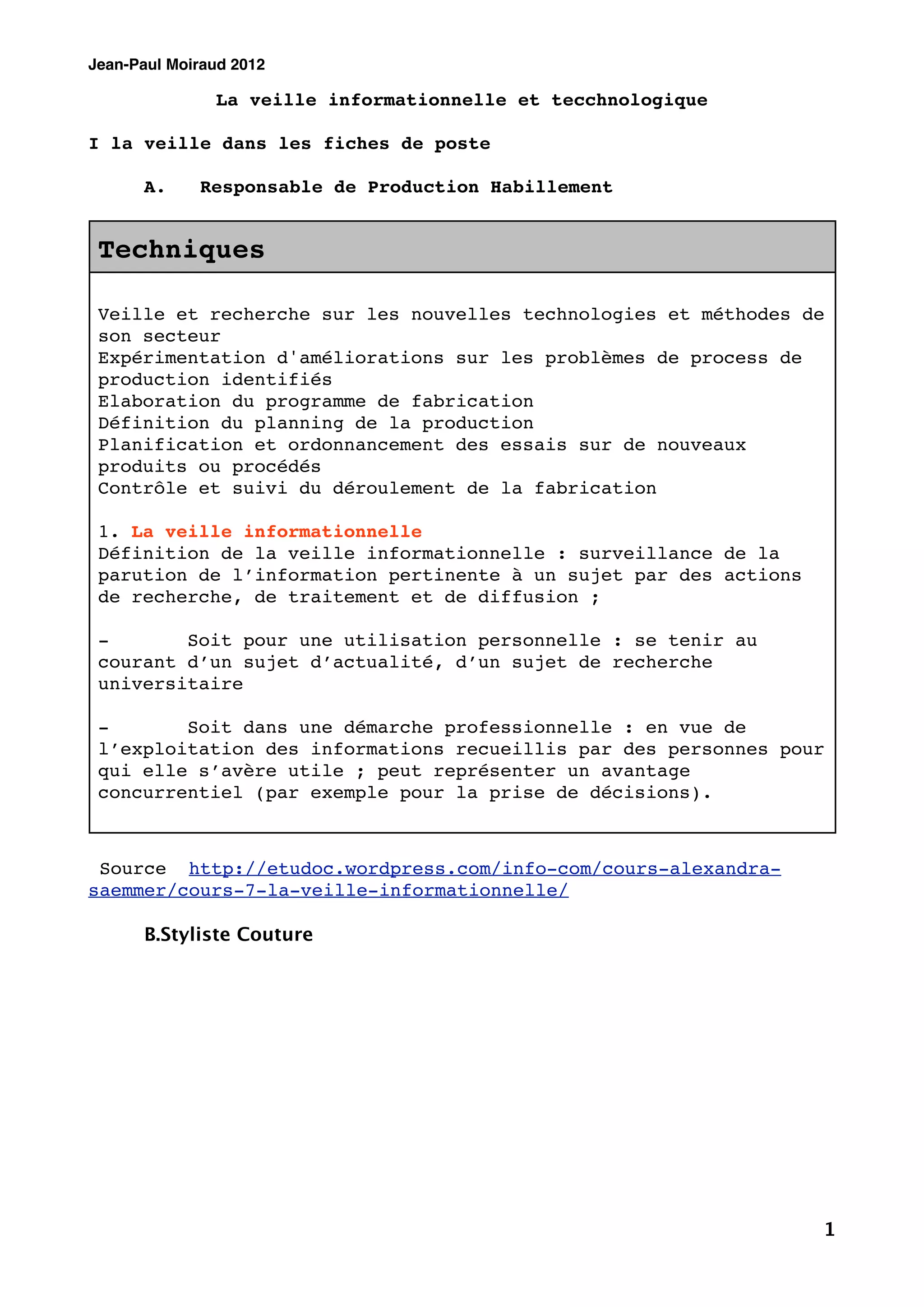 Le document présente des notions clés sur la veille informationnelle et technologique, soulignant son importance pour les professionnels du secteur de la mode et du textile. Il décrit la veille comme un processus continu de surveillance et d'analyse d'informations pertinentes, en mettant l'accent sur l'utilisation d'outils numériques comme Twitter pour structurer et organiser cette veille. Il aborde également l'importance de la connaissance sectorielle et de la collaboration pour une veille efficace.
