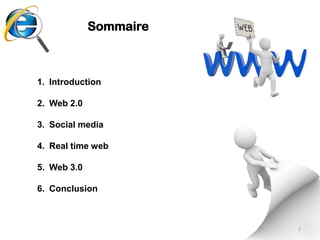 Ce document analyse l'évolution du web, avec un focus sur le passage du web 1.0 au web 2.0, et les attentes autour du web 3.0. Il évoque les tendances majeures telles que le partage de contenus, l'interaction sociale via les réseaux sociaux, la portabilité, et les innovations comme le web sémantique. En conclusion, il prédit une participation plus collective et des outils intelligents pour une expérience utilisateur améliorée.
