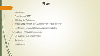 Ce document traite de la veille digitale et de ses impacts sur le webdesign et le marketing, en présentant des tendances récentes et des innovations telles que le material design, les publicités conversationnelles, et l'usage de la réalité augmentée. Il met en avant des stratégies efficaces utilisées par les entreprises pour suivre la concurrence, adapter leurs contenus et engager les clients, tout en expliquant l'importance de s'adapter aux nouvelles attentes des utilisateurs. Enfin, il aborde des techniques telles que le click & collect et le marketing conversationnel qui sont essentielles dans l'ensemble du paysage numérique actuel.