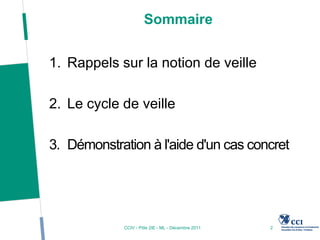 Le document traite de l'importance et de la méthodologie de la veille sur Internet, en mettant en avant le cycle de veille qui inclut la définition des besoins en information, la sélection des sources, la collecte et l'analyse des informations. Il démontre également un cas concret illustrant les besoins spécifiques d'une PME dans le secteur des dispositifs médicaux et comment établir une veille efficace. Enfin, il propose des outils et des techniques pour optimiser la collecte et le partage des informations.