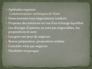 Le document traite des techniques de vente dans le commerce international, décrivant le processus de vente, ses différentes étapes et types, ainsi que l'importance de comprendre les motivations des clients. Il aborde également les stratégies de négociation et d'argumentation, en soulignant l'importance de l'écoute et de la communication dans l'établissement d'un climat de confiance. Enfin, il présente la pyramide des besoins de Maslow comme outil pour hiérarchiser les motivations des prospects.