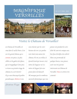 Le château de Versailles, situé au sud de Paris, est un immense complexe de 700 pièces, dont la célèbre galerie des glaces avec ses 578 miroirs. Entouré de jardins étendus de 1000 hectares et du grand canal, il offre également des spectacles uniques en été avec des feux d'artifice. Une visite promet une expérience enrichissante et mémorable.